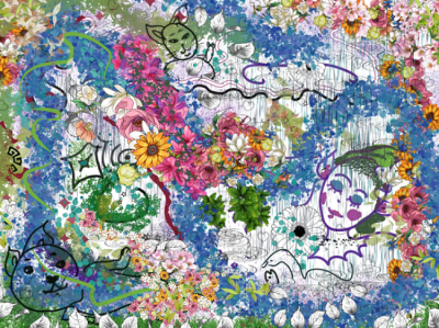 A happy Alice in Wonderland panorama of various creatures and flowers with different digital styles.